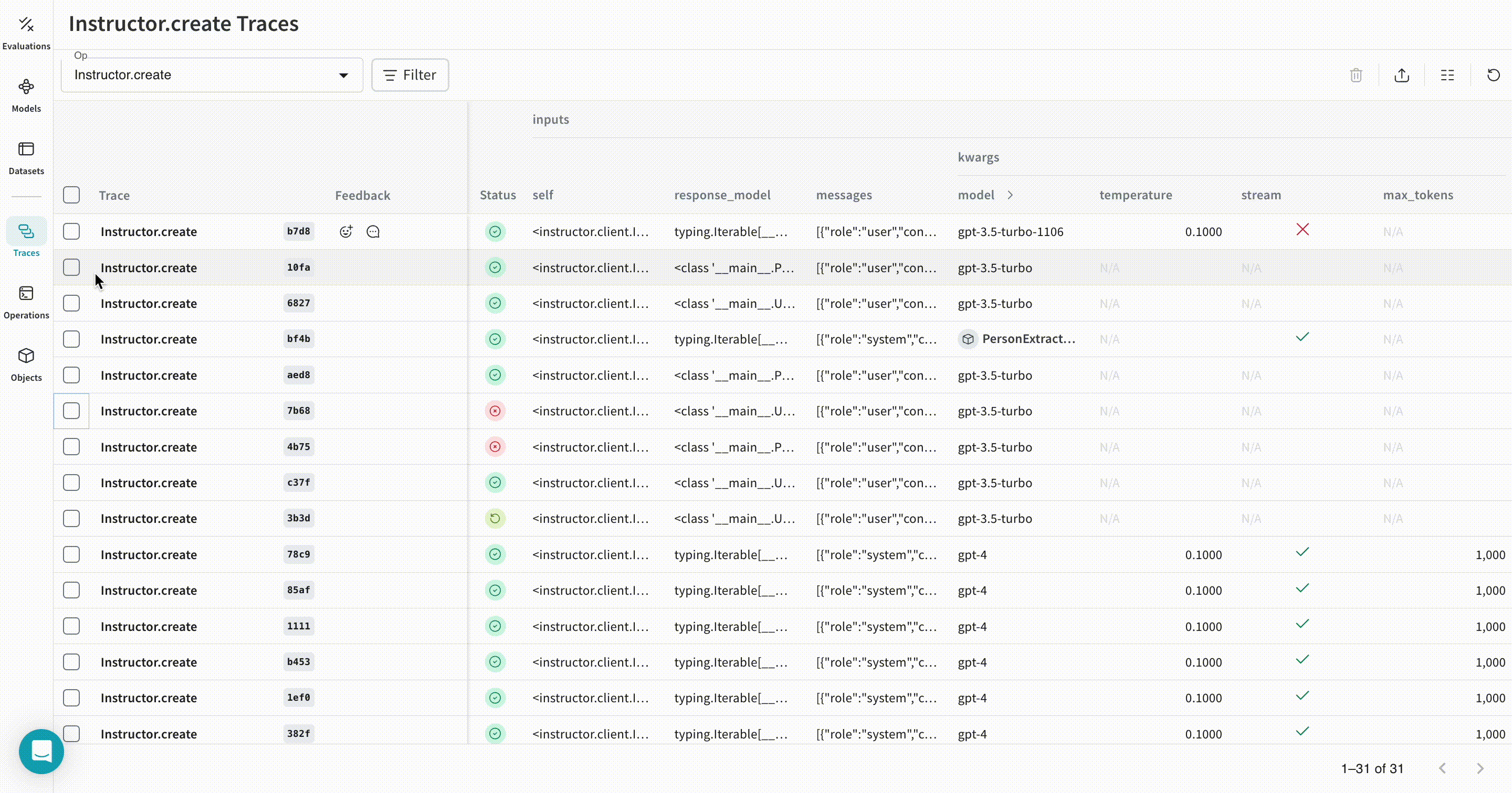 | Weave will now track and log all LLM calls made using Instructor. You can view the traces in the Weave web interface. |